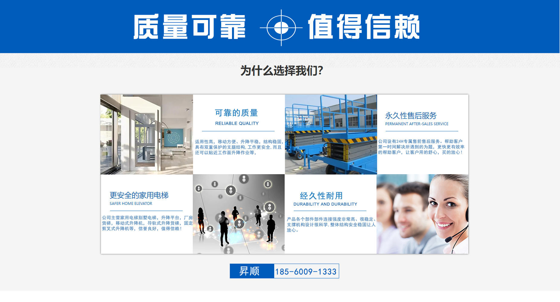 山東昇順液壓升降機械有限公司是一家主營家用電梯,別墅電梯,升降平臺,廠房貨梯,移動式升降機,導(dǎo)軌式升降貨梯,固定剪叉式升降機等產(chǎn)品企業(yè),質(zhì)量可靠,值得信賴。 用戶至上,以用戶為中心”是公司永遠(yuǎn)堅持的服務(wù)宗旨,贏得用戶的贊許是我們的榮譽,及時滿足用戶的需求,是我們公司的愿望。長期以來,公司員工以優(yōu)質(zhì)的服務(wù),取悅于用戶,以誠信的言行取信于用戶,得到了用戶們的好評。我們期待著與您更加愉快的合作!公司的發(fā)展,離不開社會的大力支持,在社會的支持和幫助下,我們正昂首闊步邁向未來! 我們的經(jīng)營方針是:以質(zhì)量求生存,以產(chǎn)品求發(fā)展,以信譽保合作,以服務(wù)贏客戶。 本公司對產(chǎn)品質(zhì)量和各項服務(wù)恪守合同承諾,并愿與新老客戶精誠合作,共創(chuàng)未來。 公司精神:創(chuàng)新是主題,超越是不懈的追求。 公司宗旨:信譽保證,誠信為本。 我們會以合理的價格,良好的信譽,雄厚的實力,優(yōu)質(zhì)的產(chǎn)品,最周到的服務(wù),服務(wù)于廣大新老客戶!...